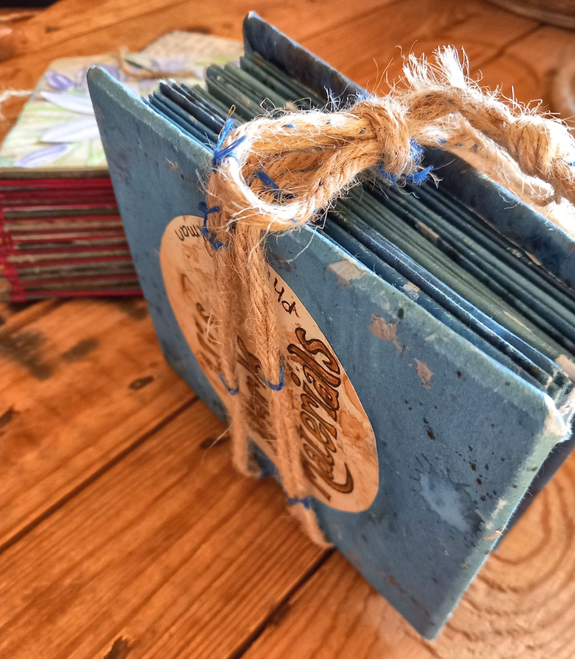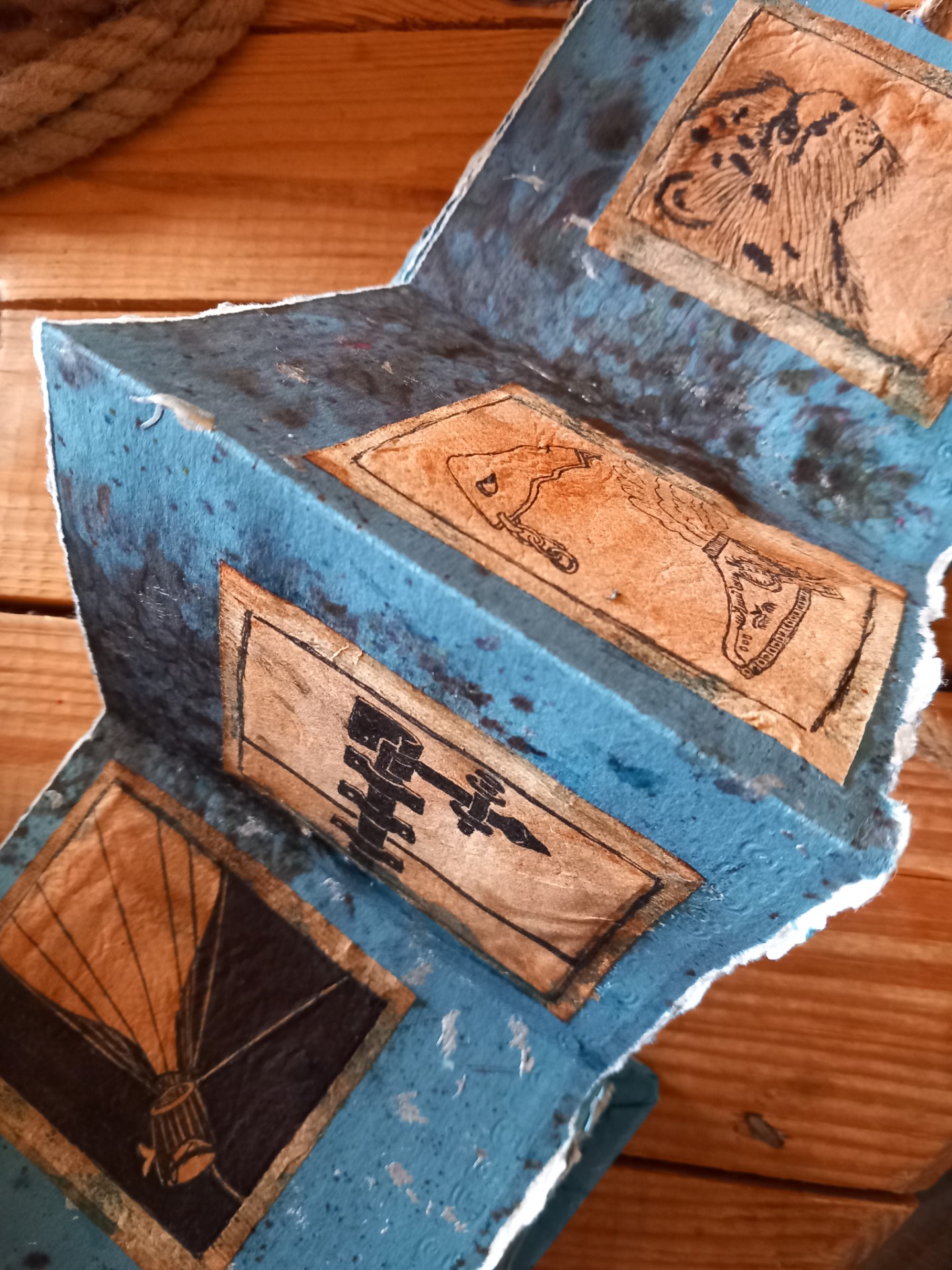 A concertina sketch book – pictures below show 2 different size books. They can be made with hand dyed paper or if you prefer a variety of different papers, wall paper, brown paper, tracing paper to name just a few.