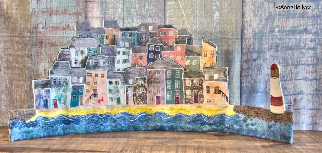 Quayside Postcard Kit – This kit contains all the materials you need to create one fabric postcard measuring 10 x 15cms. It also includes instructions and a selection of hand stitch threads and a needle, an ideal gift or present to yourself. £15 plus p & p