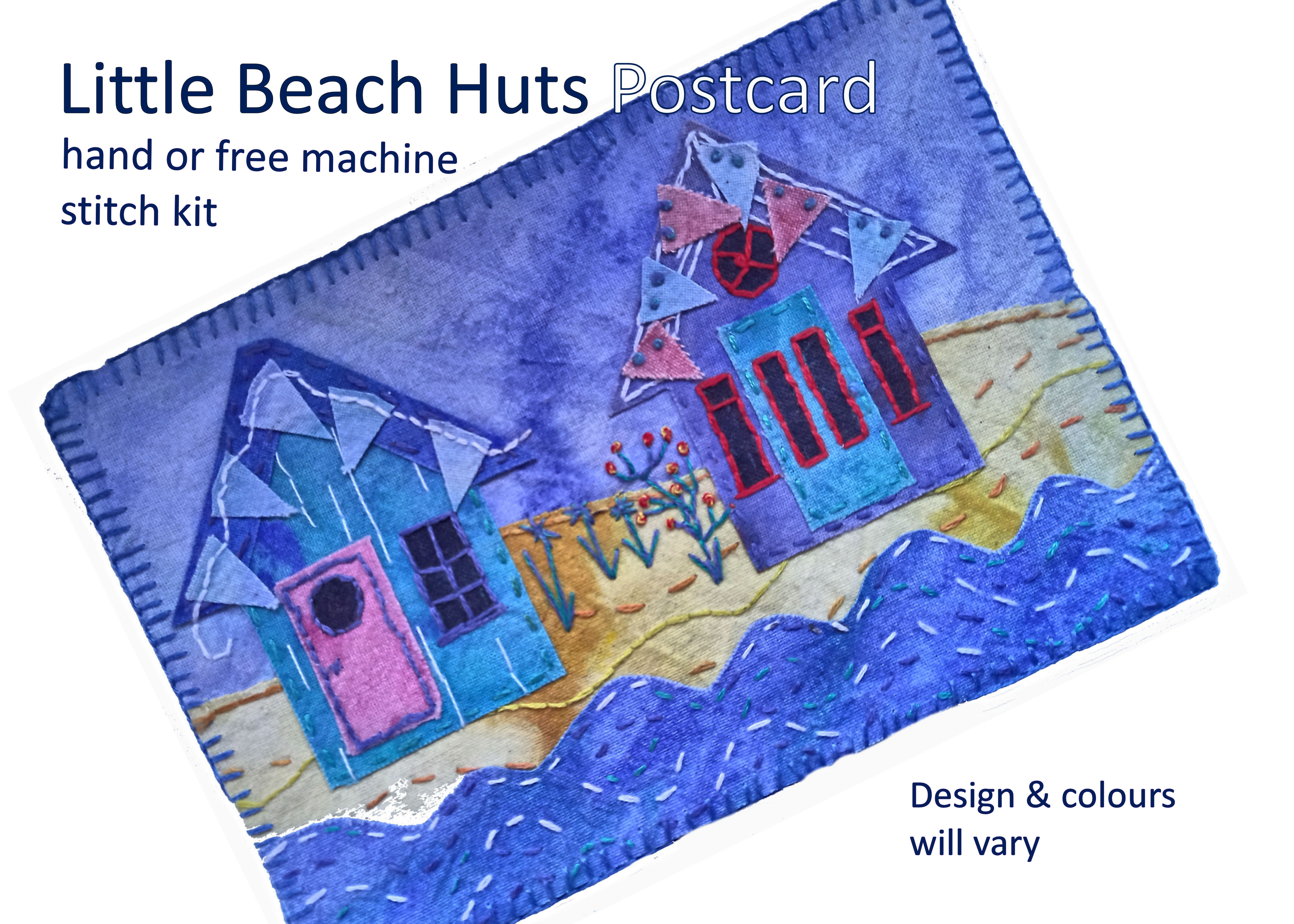 Beach Hut Postcard Kit – This kit contains all the materials you need to create one fabric postcard measuring 10 x 15cms. It also includes instructions and a selection of hand stitch threads and a needle, an ideal gift or present to yourself. £15 plus p & p